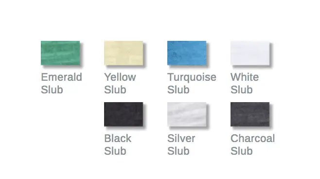 | Colour | Emerald Slub, Charcoal Slub, White Slub, Turquoise Slub, Silver Slub, Yellow Slub, Black Slub |